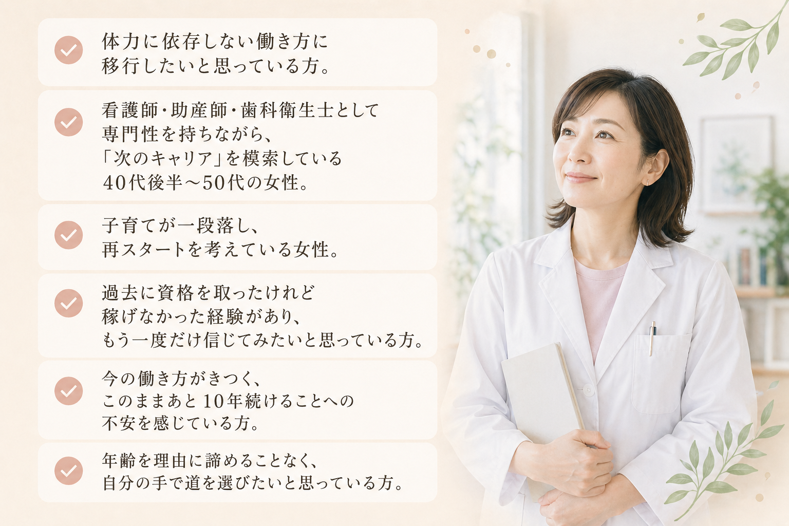 年齢と経験に見合った働き方を設計できる専門性は、必ずお渡しします。